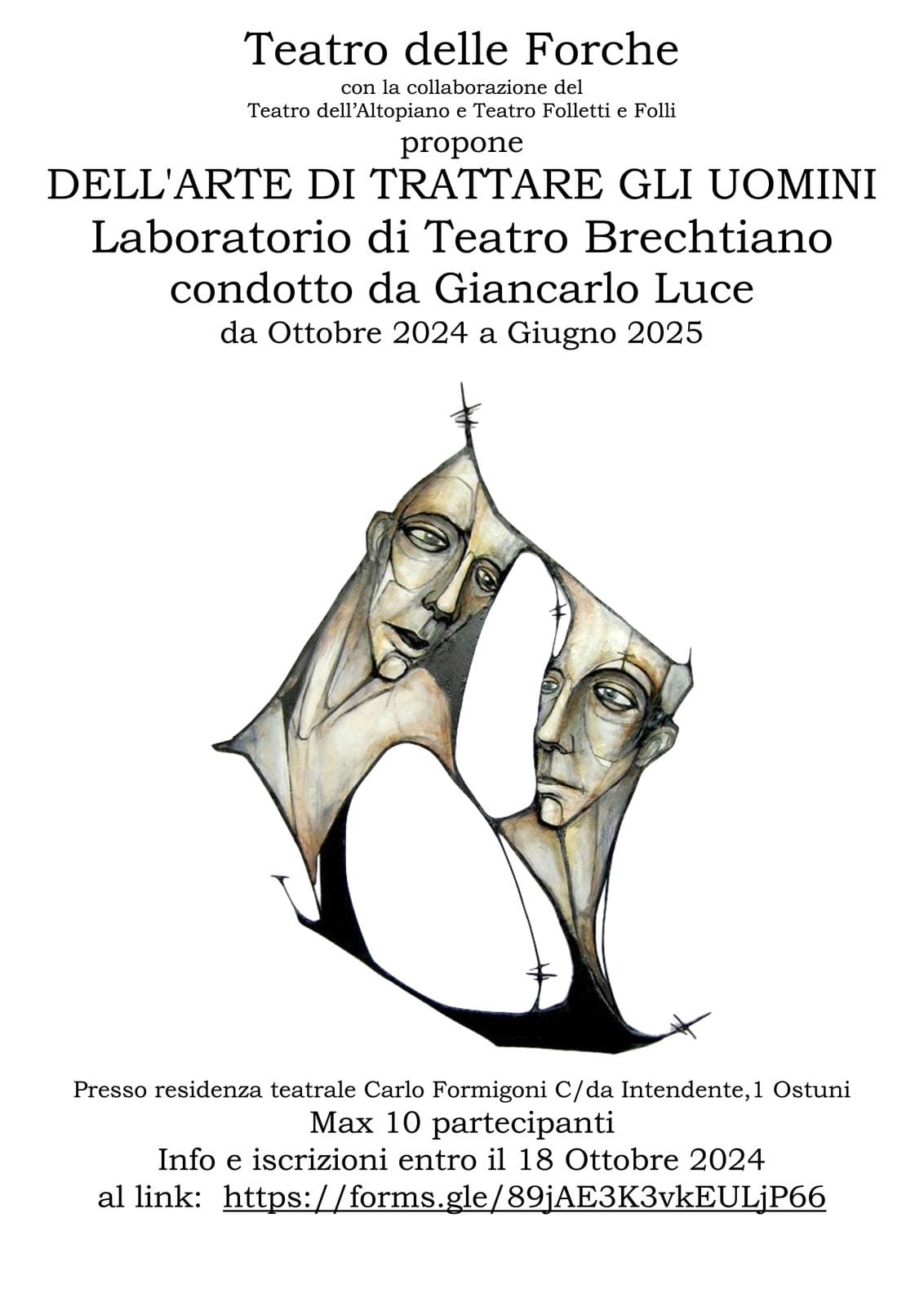 ?? | Cosa: Laboratorio teatrale organizzato da Teatro delle Forche Società Cooperativa Sociale A.r.l. di Massafra, con la collaborazione di Teatro dell'Altopiano e Teatro Folletti e Folli, che prevede come linea principale di approfondimento il teatro di Bertolt Brecht e la tecnica Brechtiana quali strumenti d'orientamento all’arte teatrale, a partire dai suoi scritti e dalla sua visione della realtà contemporanea per interpretare il mondo da una prospettiva concreta e sorprendente. Prendersi un tempo per sperimentare le forme della narrazione legate a specifiche tecniche, come la terza persona e lo straniamento, ideate e utilizzate da Brecht nel suo teatro e per i suoi attori. L’auspicio sarà quello di dar vita, a fine percorso, ad una messa in scena di un’opera o di una composizione poetica scritta da Brecht.