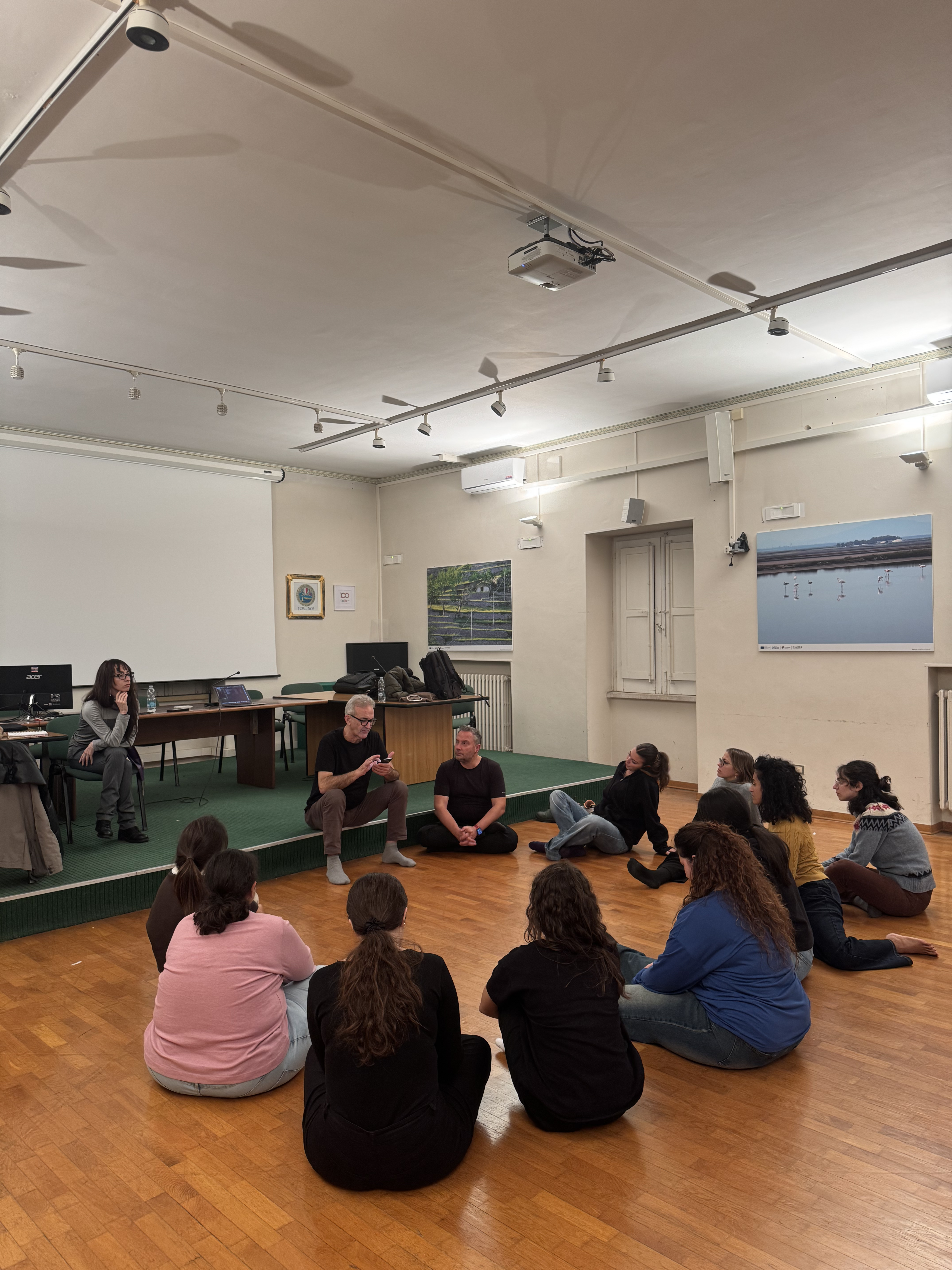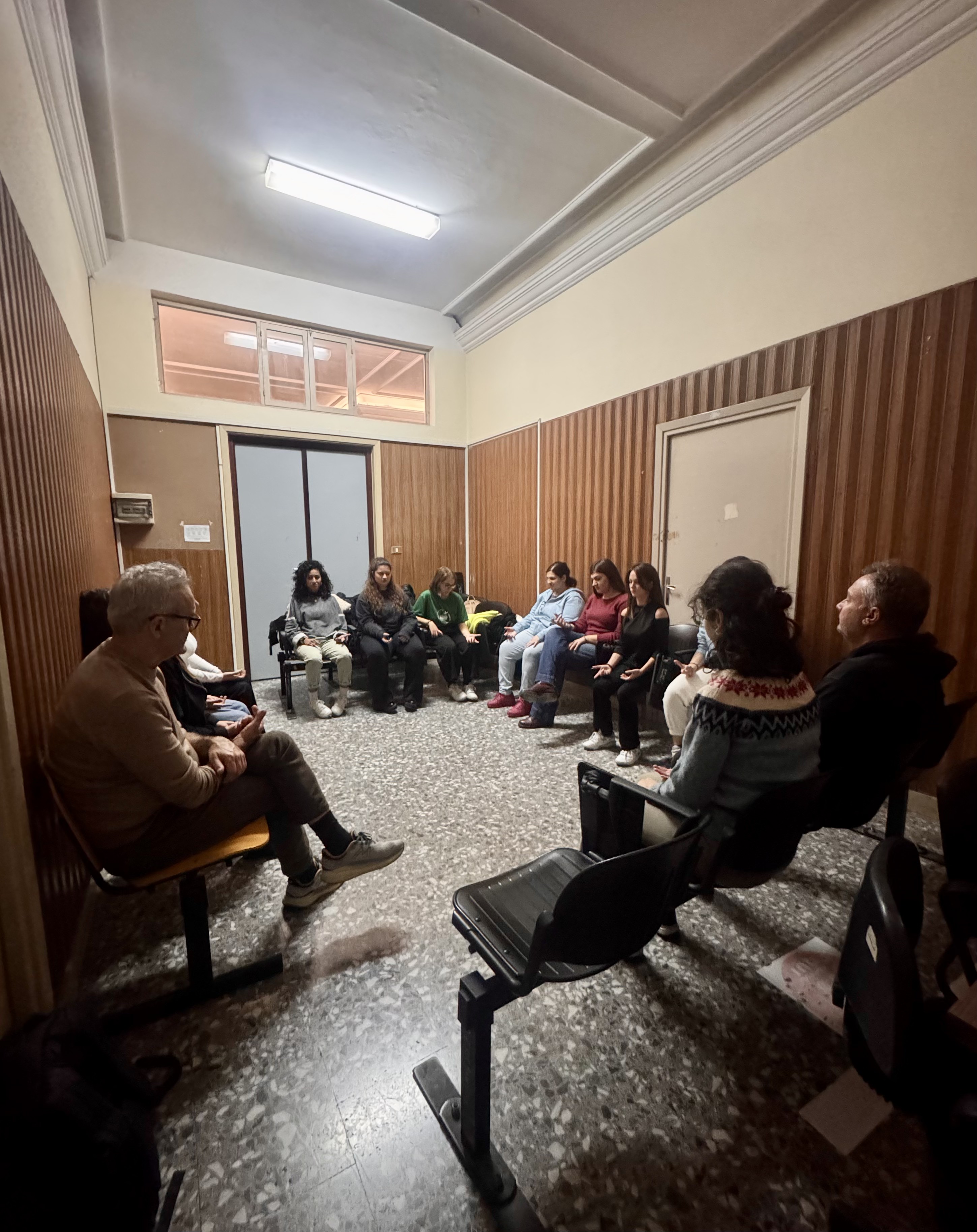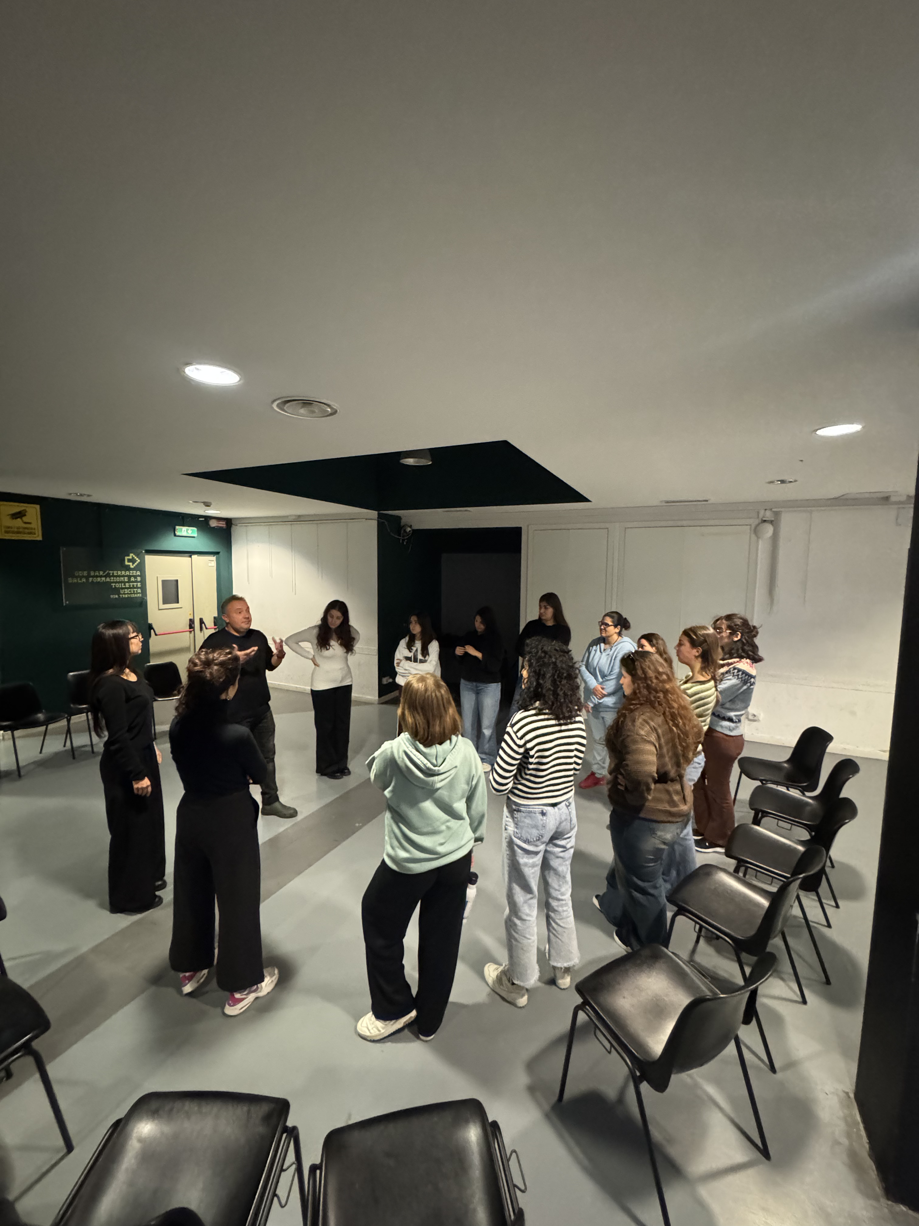 Il laboratorio ha alternato momenti teorici a pratiche di improvvisazione, lavoro sul corpo e sulla voce, sperimentazione di testi e scritture sceniche del maestro Carlo Formigoni.